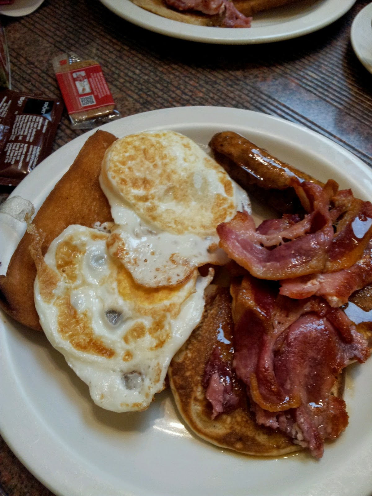 Usually when we go back to a place we always try something different but sorry we enjoyed this so much last time we had to have it again. We both went for the American Breakfast. It is a real indulgence, you get all the regular things like fried bread, bacon, sausage and eggs plus pancakes with maple syrup. Very good value at £5.95 and it includes your coffee or juice if you prefer.